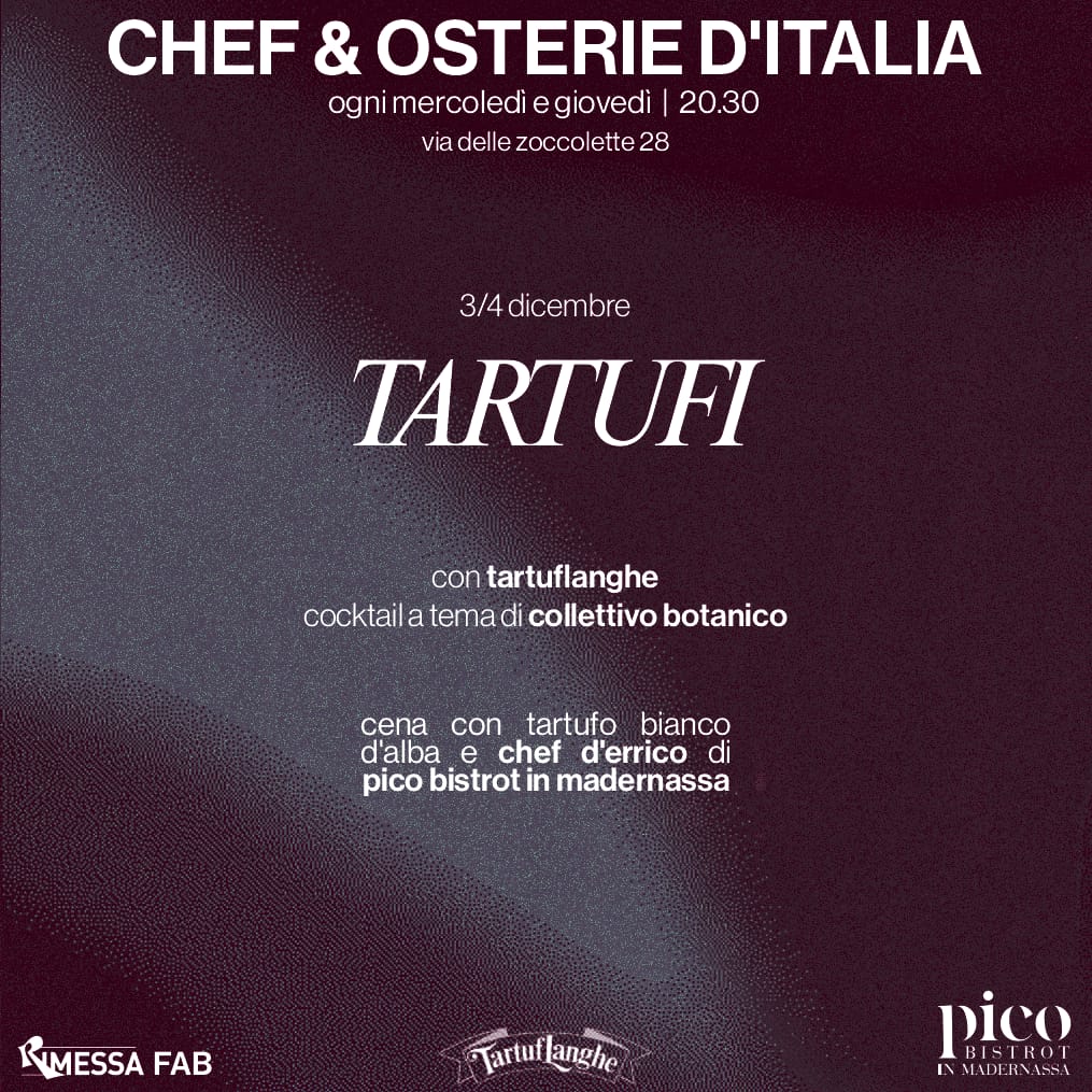 Il 3 e 4 dicembre ospitiamo Paolo Montanaro di Tartuflanghe, insieme agli chef Giuseppe e Francesco D’Errico del Pico Bistrot in Madernassa.Una cena sospesa tra boschi, chimere, derive gastronomiche e...