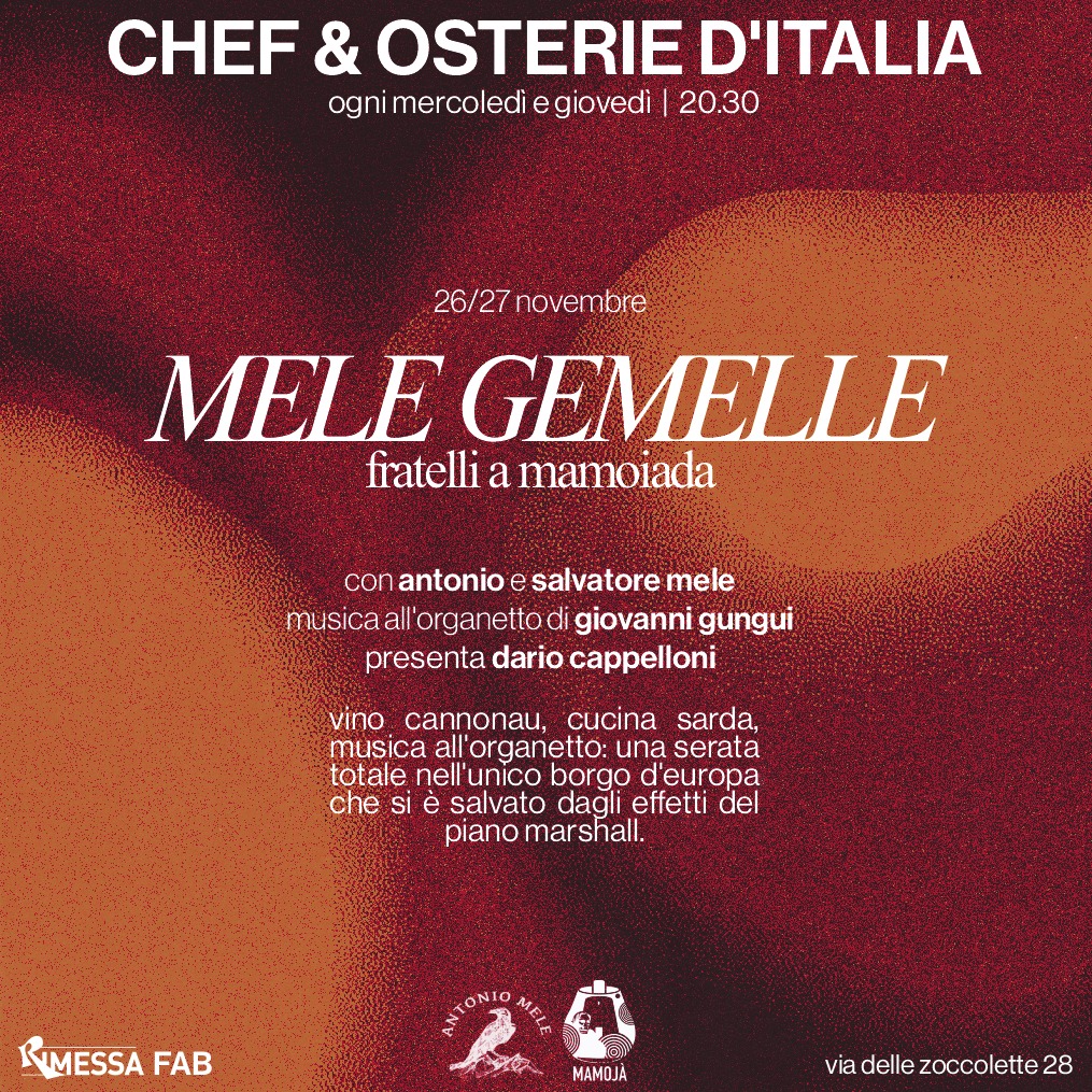 26 novembre – Mele Gemelle / Fratelli a Mamoiada - 65€ Con Antonio e Salvatore Mele (Bar Mele, Mamoiada) Presenta Dario Cappelloni Vino Cannonau, cucina sarda, musica all’organetto del maestro...